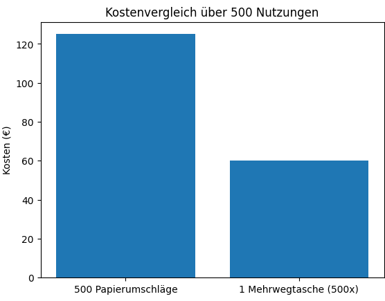 500 Einweg-Papierumschläge kosten etwa 125 €, während die Mehrwegversandtasche inklusive Anschaffung und Logistik bei rund 60 € liegt.