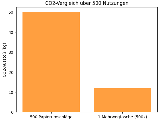 Das Diagramm zeigt den Unterschied der gesamten CO₂-Emissionen bei 500 Versandvorgängen. Während 500 Papierumschläge rund 50 kg CO₂ verursachen, liegt die Mehrwegversandtasche bei nur etwa 12 kg CO₂.